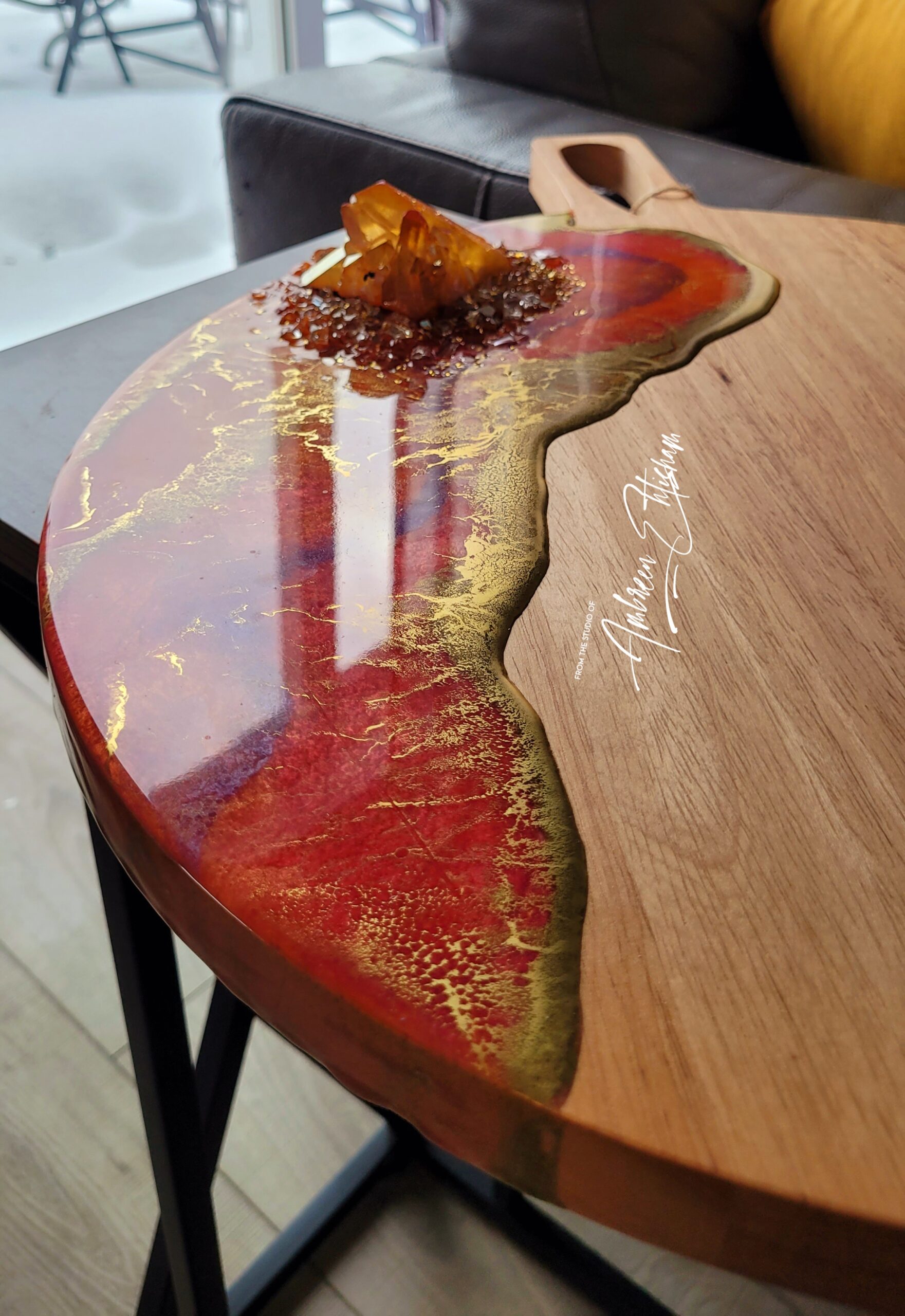 Add style, beauty and function to your kitchen or home with this versatile Acacia Wood cutting board with citrine aura crystal infused art. It features a rich, deep color of wood , that provides visual interest. This 15 inch cutting board also makes an ideal serving piece for cheese assortments, breads or sliced vegetables.