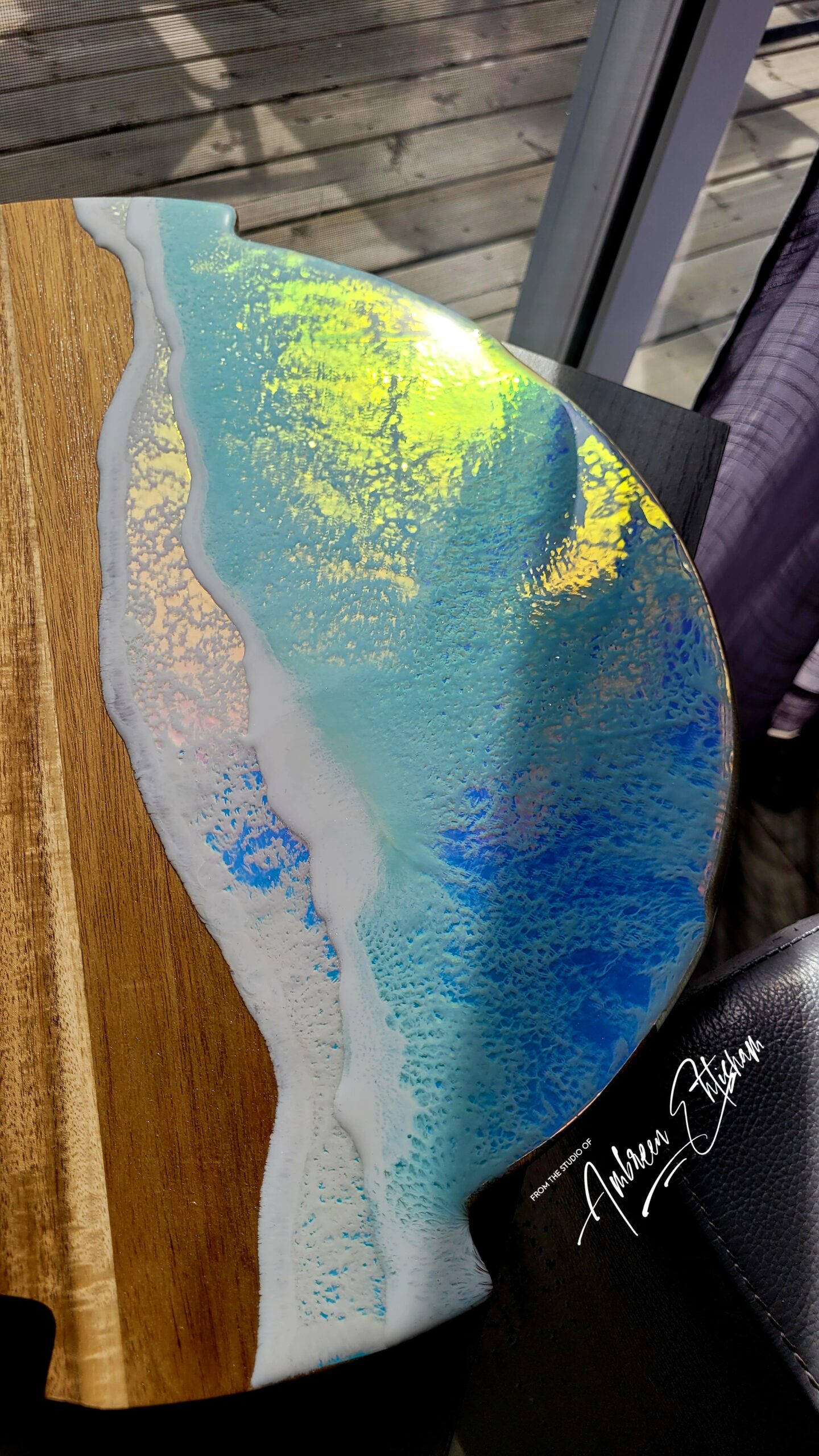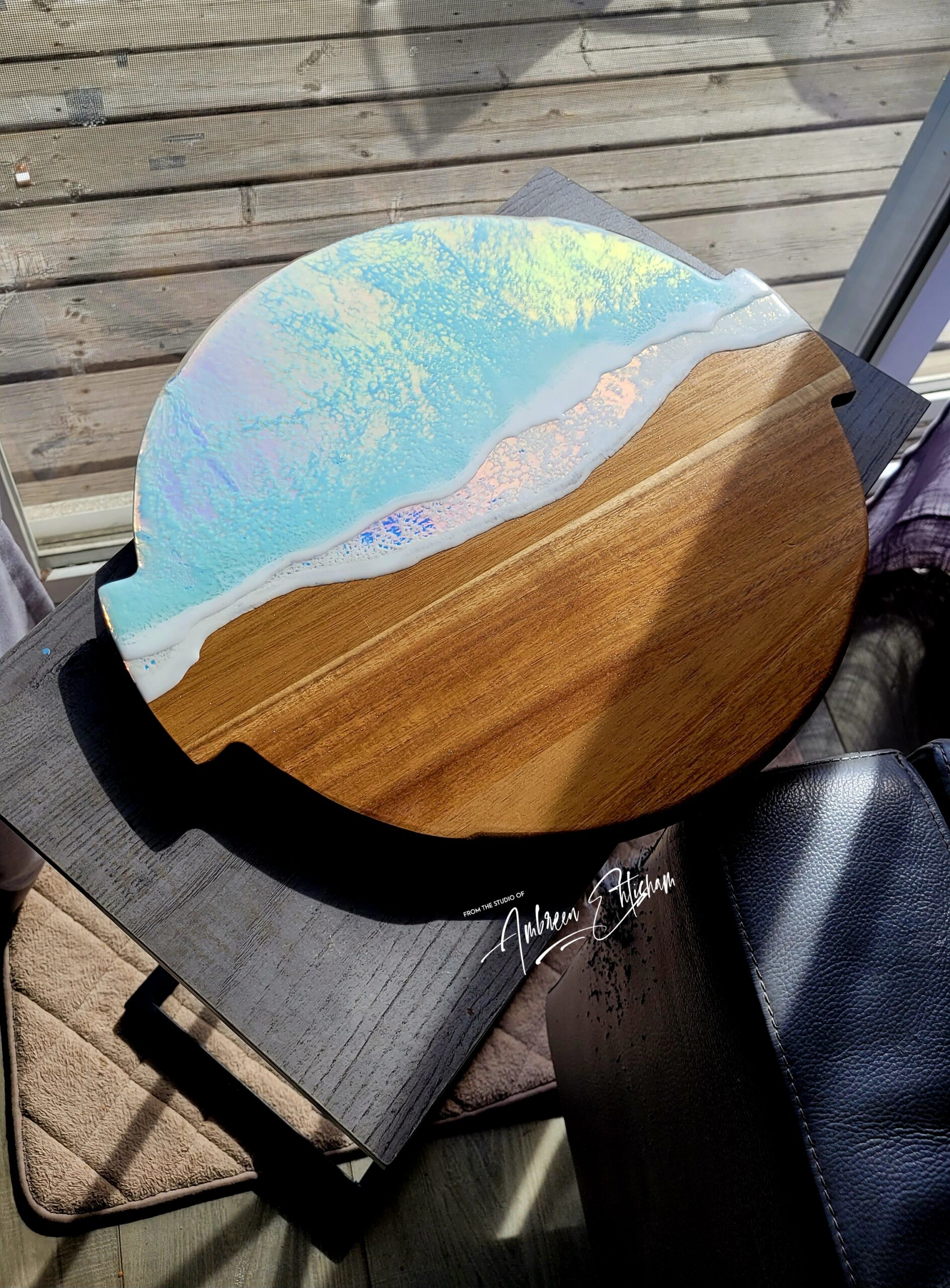 Add style, beauty and function to your kitchen/Living room with this versatile Acacia Wood lazy Susan with resin ocean art.  It features a rich, subtle colors of holographic ocean, that provides visual interest. This 15.5″ (diameter with handles) lazy susan also makes an ideal serving piece for cheese assortments, breads or sliced vegetables. You can customize it by adding your name or date with an additional extra charges.