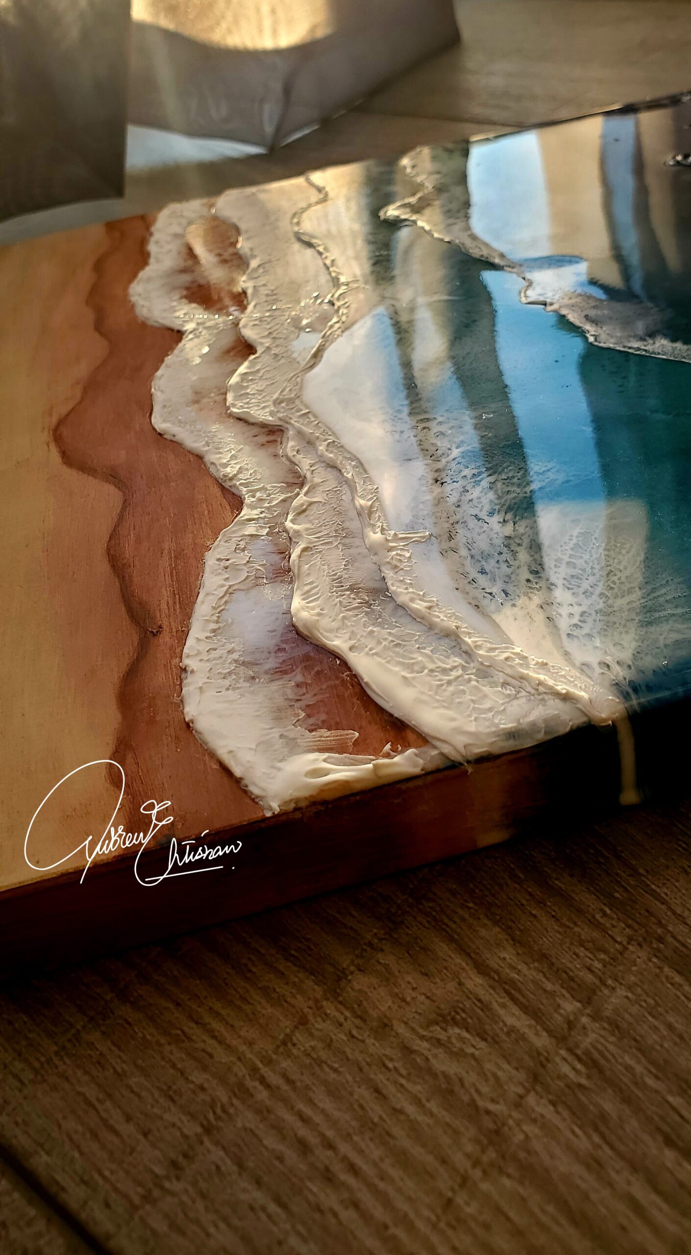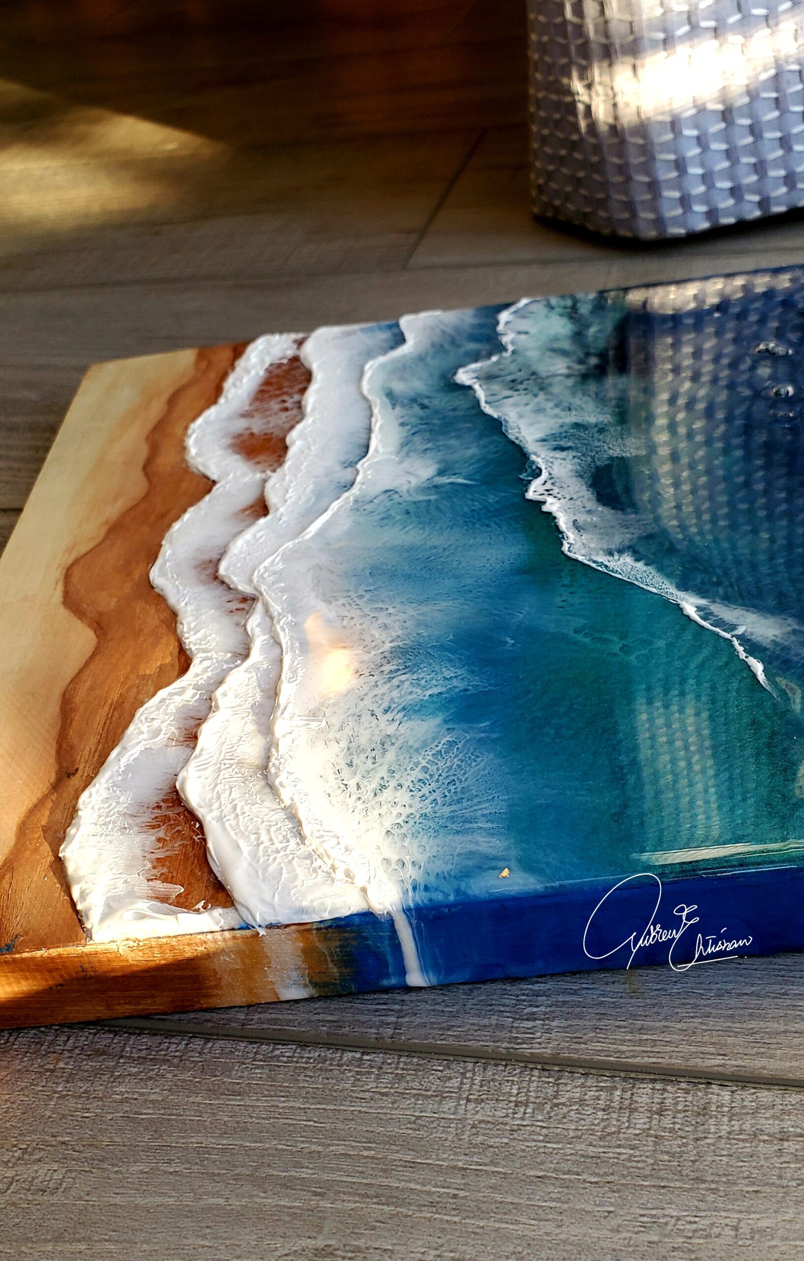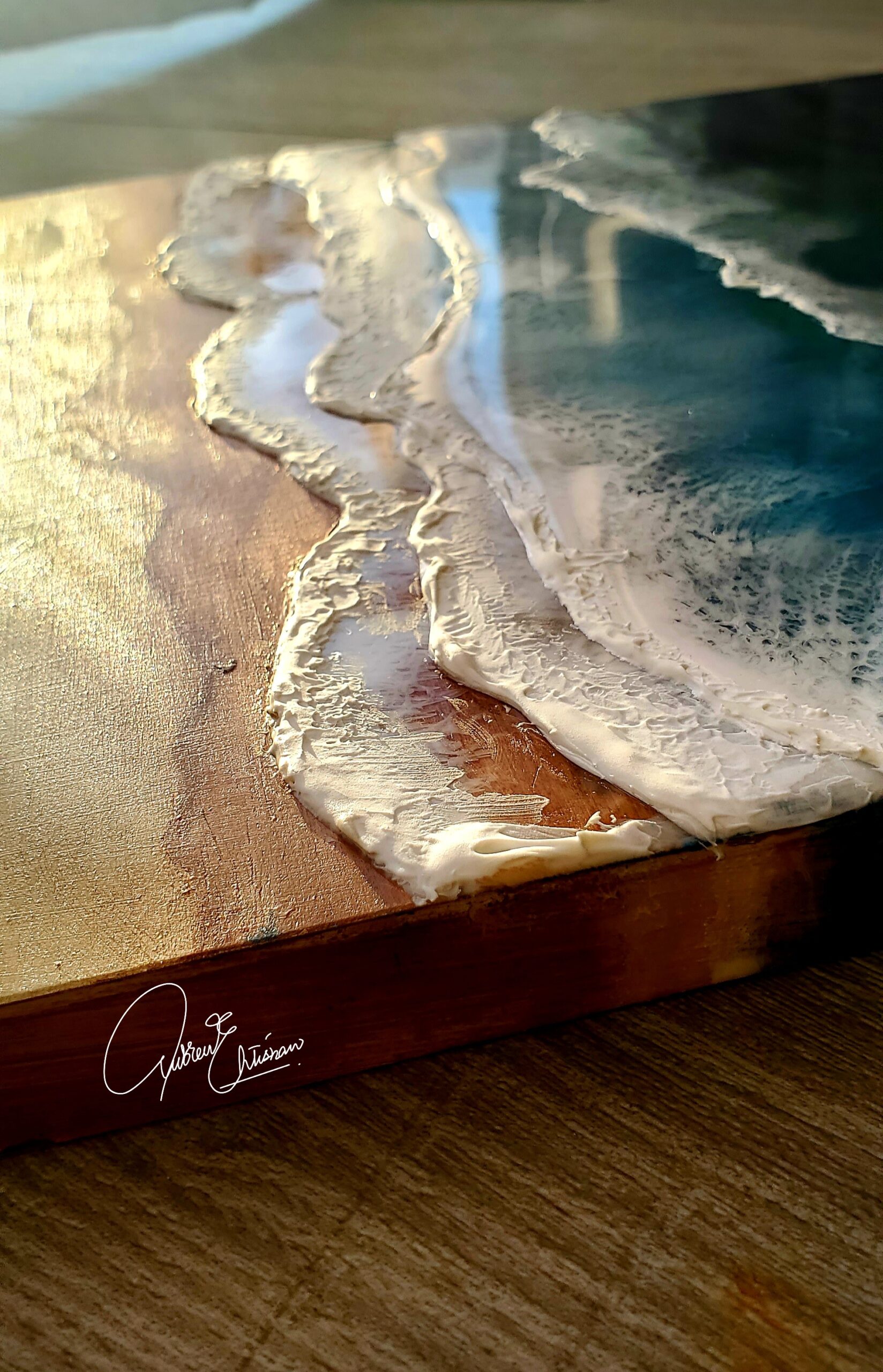 It is a 10 x 10-inch ocean-inspired artwork on a birch-wood panel. Made with 4 layers of resin to form 3D waves. It reminds you of crashing waves on the seashore.